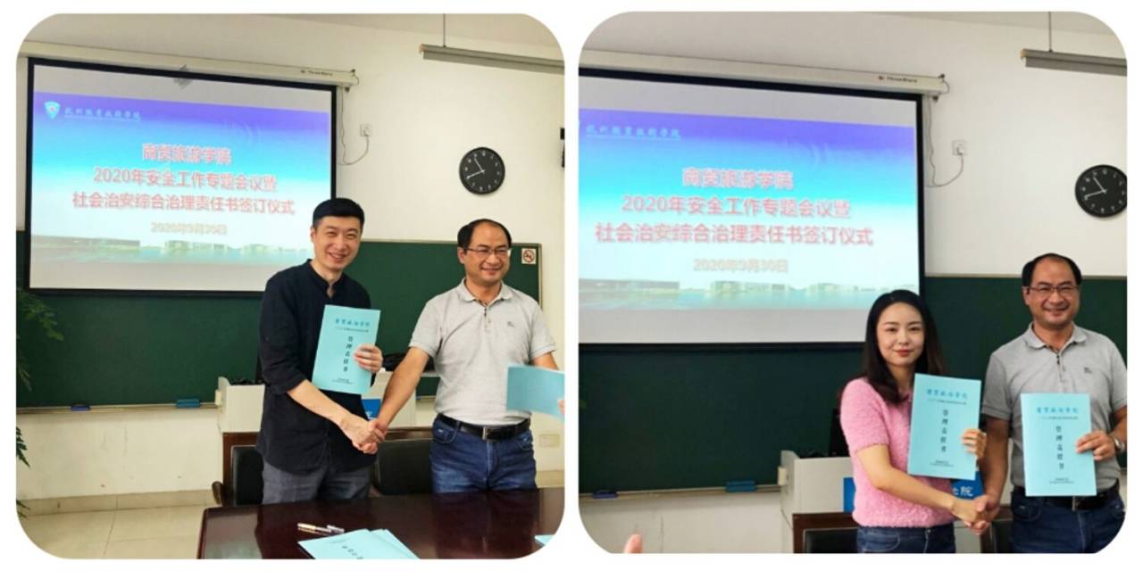 会议开始,张赵根与专业代表和部门代表签订了社会治安综合治理责任书,他说,签订仪式不仅是一种责任传达,更是一种责任落实和责任担当。袁江军做了教学实训室安全工作指示,他提醒教师在做好公司产品工作、实训室安全工作的同时,也要注意自身意识形态建设。周佳良提醒全体教职工注意节假日安全、人身安全和财产安全。