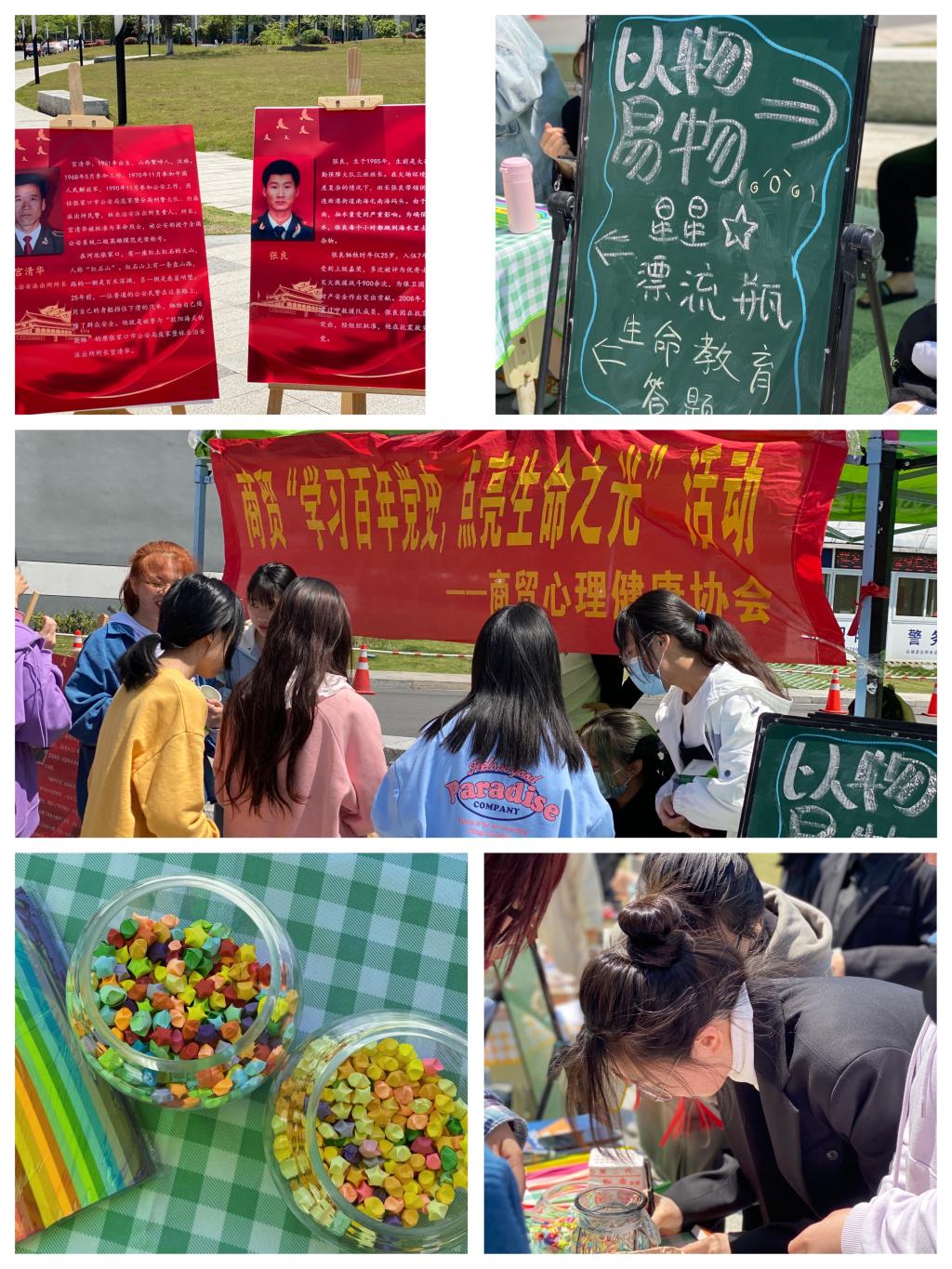 本次线下活动,围绕生命教育主题,开展三个系列小活动,“星星漂流瓶”传递正能量,发泄负能量;“以物易物”利用闲置,分享生命故事;“党史问答”汲取先烈精神力量,思考如何提升生命价值、实现生命价值,系列活动相辅相成,各具内涵。除三个主要活动外,现场还设有先烈事迹展板以加深员工对党史人物故事的理解,加深生命教育活动意义。